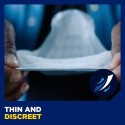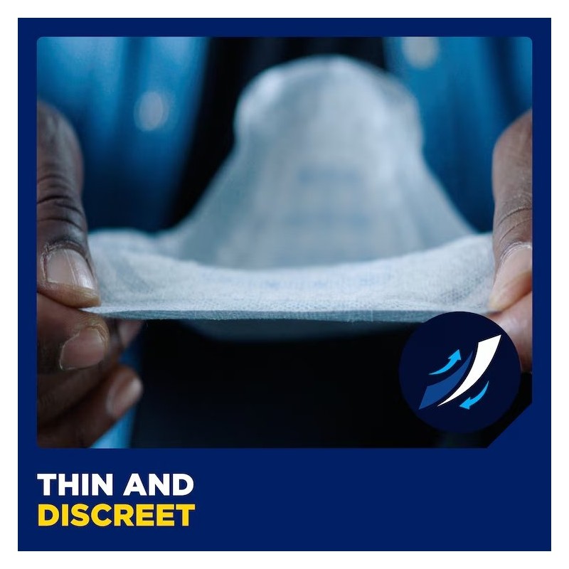 TENA indlægget er forsynet med en tapestrimmel, som sikrer, at indlægget bliver på plads i tætsiddende herreunderbukser. Hvert indlæg er individuelt pakket ind, hvilket giver mulighed for diskret bortskaffelse.